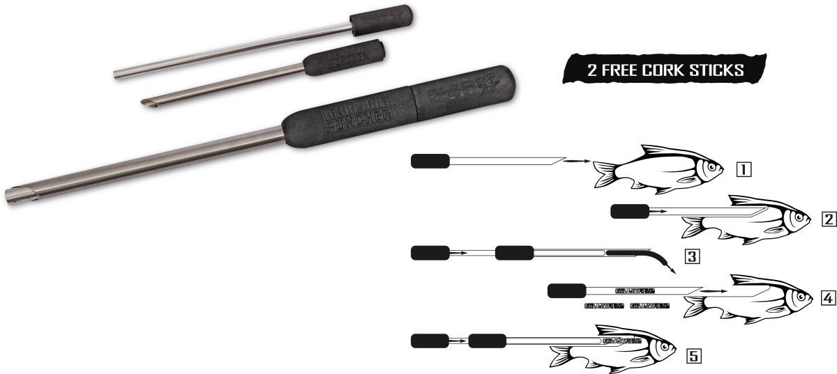 Der Puncher wurde speziell von Stefan Seuß für den Einsatz fängiger Dead-Bait-Montagen entwickelt. Das scharfkantige, seitlich angeschränkte Einschubrohr dringt messerscharf in den Rücken der Köderfische ein und entnimmt durch leichtes Drehen des Punchers ein Stück Rückenfilet. In den entstandenen Hohlraum des Köderfisches können nun Dead Bait Sticks oder Cork Sticks eingeschoben werden und verleihen dem Dead Bait natürlichen, waagerechten Auftrieb. In der Strömung beginnt der tote Köderfisch sehr realistisch zu schwimmen und überzeugt jeden Flusswaller.